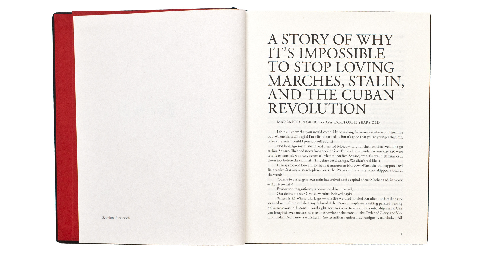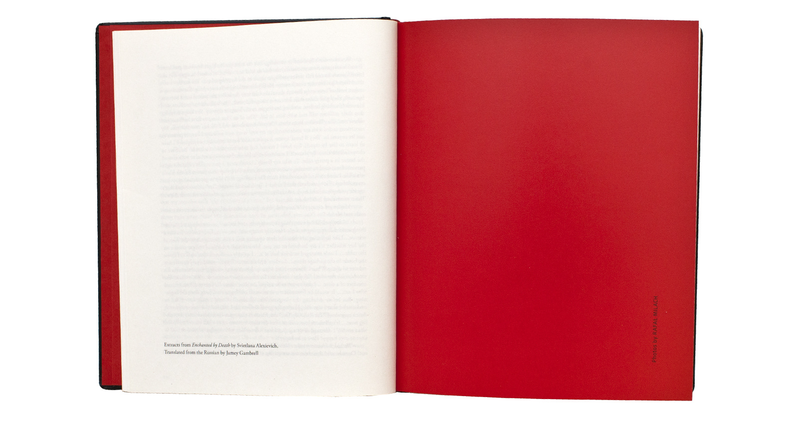 152 pages, 165 × 203 mm, texts by Svetlana Alexievich, photo editing by Rafał Milach + Jan Grarup, introduction text by Liza Faktor, hard cover, Munken Print Cream + Arctic Volume Ivory, published by Kehrer Verlag, Treemedia, 2011 and second edition by Kehrer Verlag (2013)