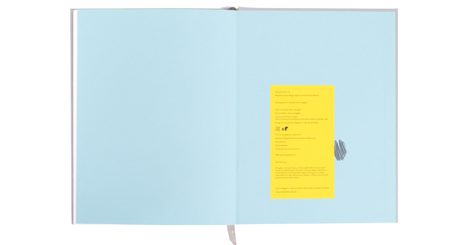 96 pages, 220 x 285 mm, photo edit by Glenn Sloggett, hard cover, manual interventions, book design: Ania Nałęcka-Milach, MultiArt Matt, printing: Chromapress / Piaseczno, binding: Poligrafia Bracia Szymańscy / Warszawa, self-published, 2014