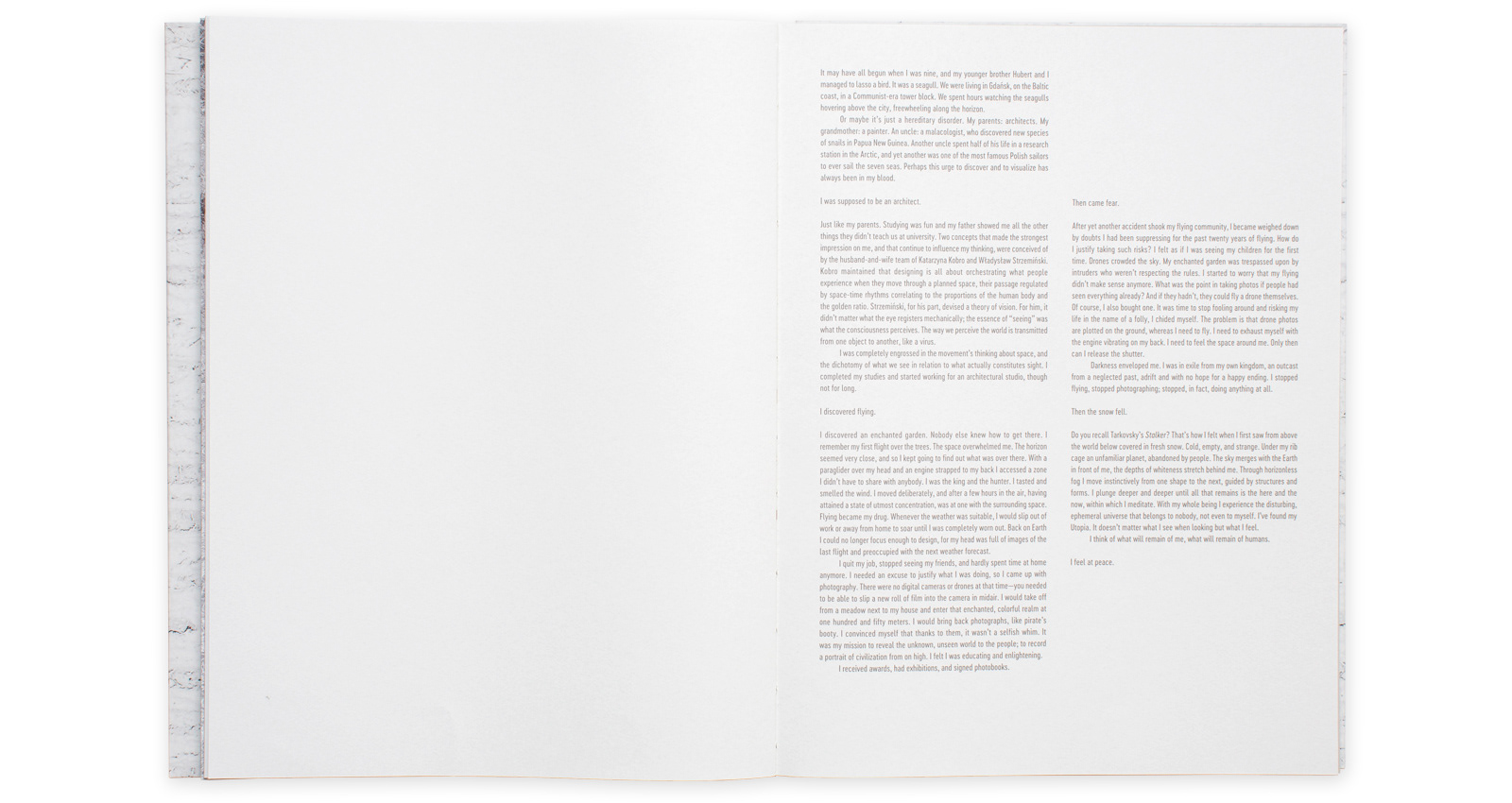dust-jacket & open spine, 235 x 310 mm, 96 pages, 46 pictures, text: Kacper Kowalski, Karolina Gałuba, book design: Ania Nałęcka-Milach, paper: Munken Lynx 100, 120, 130, 150, 170, 200 and 400 gsm, print run: 850 copies, printing: Chromapress / Piaseczno, binding: Poligrafia Bracia Szymańscy / Warszawa, publisher: Kacper Kowalski FABRYKA, 2017